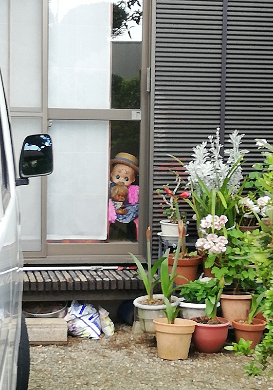 ふと横を見ると住宅の窓から2体の人形がこちらを見つめていました(^-^;